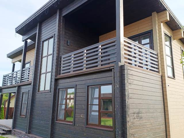 Сам загородный дом построен из клееного бруса. В прощлом году мы изготовили и установили, точней поменяли на она и двери деревянные наличники и откосы.