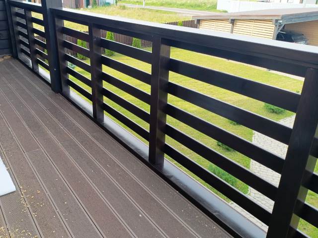 Эти летом мы установили перильное ограждение на балкон из массива лиственницы. Материал: дска сухая строганная для продольных планок 22х120 мм, для преил 38х145, столбы клееные 130х130 под заказ.