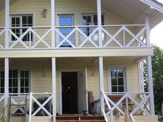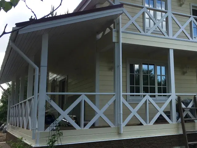 По террасе с 2 сторон дома и на балконе сделаны ограждения из сухой строганной доски 55*85 и преила 40*120 мм. Все элементы из сосны и покрашены фасадной краской по дереву.