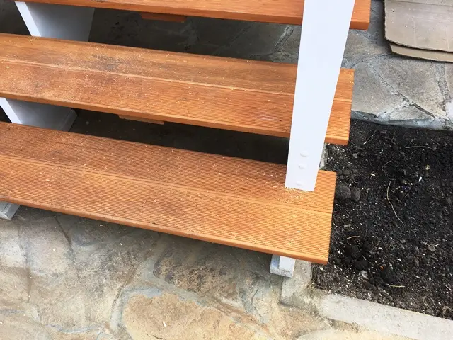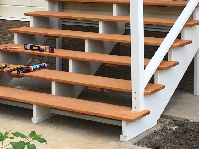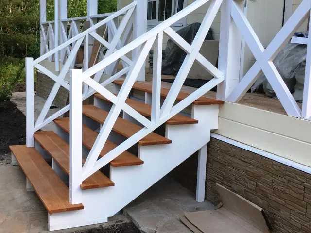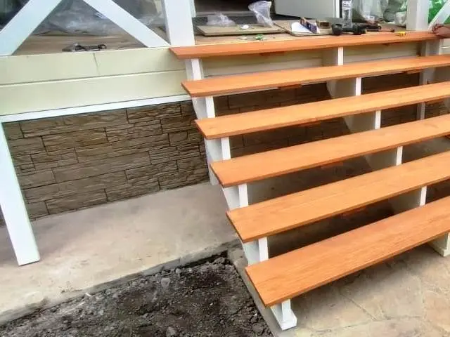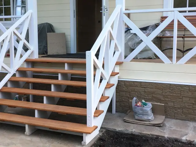 Само крыльцо мы сделали из террасной домки лиственница 24*142 мм, косоуры несущие 3 штуки на 6 ступенек из фанеры влагостойкой. Перильной ограждение из бруска 60*60, стобы 80*80 и перила 6*75 мм.