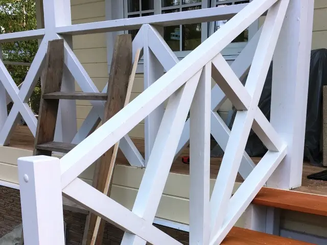 На фото установленное нами ограждение на балкон, террасу и уличное крыльцо из деревянных бруском с видом "крест накрест". Перила на крыльце отличаются по размеру немного.