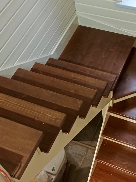 Деревянная лестница, разворот на 180 градусов, с промежуточной площадкой, с забежными и прямыми ступенями. Покраска дубовых ступеней выполнена колерованным лаком на водной основе с полиуретановыми добавками, подступенки укрывной краской.