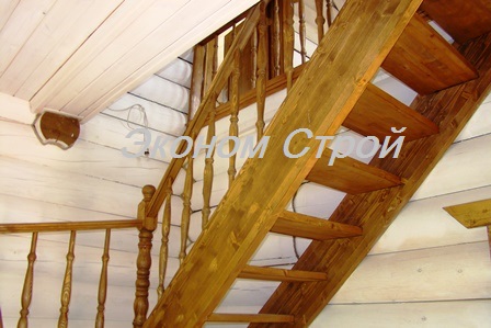 Лестница из массива сосны с площадкой и перилами, для дачного дома из бревна под заказ.