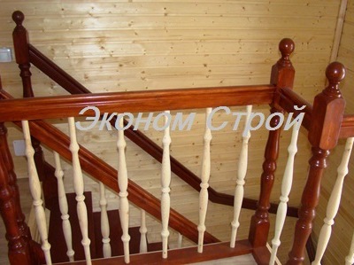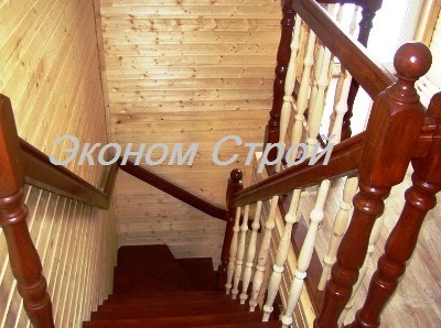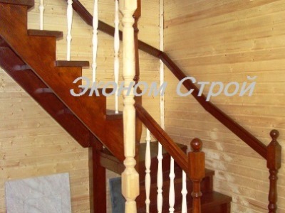 На второй этаж каркасного дома нами сделана лестница из сосна-ель, "Г" образной конструкции с промежуточной разворотной площадкой, на косоурах треугольных, без подступеней. Ограждение с балясинами по одной стороне и пристенный поручень.