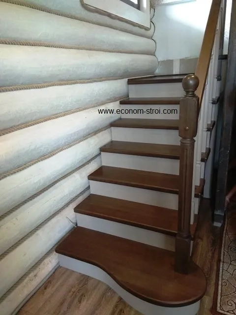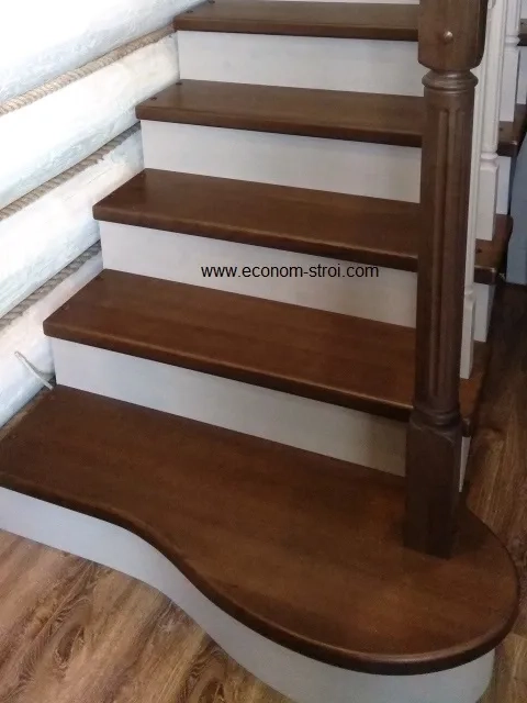 Комбинированная лестница из дуба и массива сосны и полукруглая ступенька.