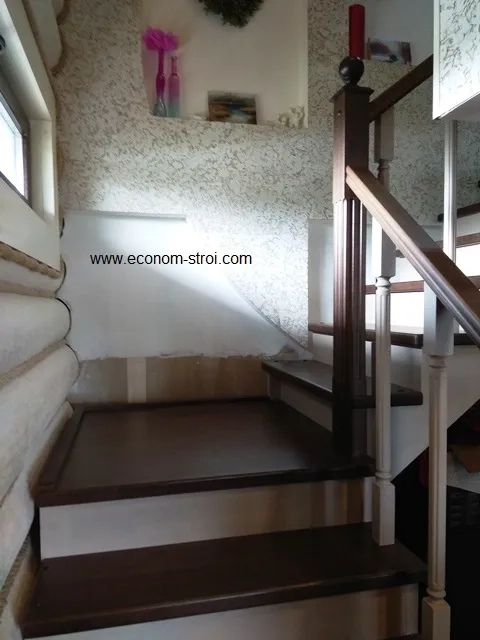 В частном доме из рубленного бревна нами установлена на второй этаж поворотная лестница "Г" образного типа с ограждением с одной стороны.