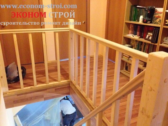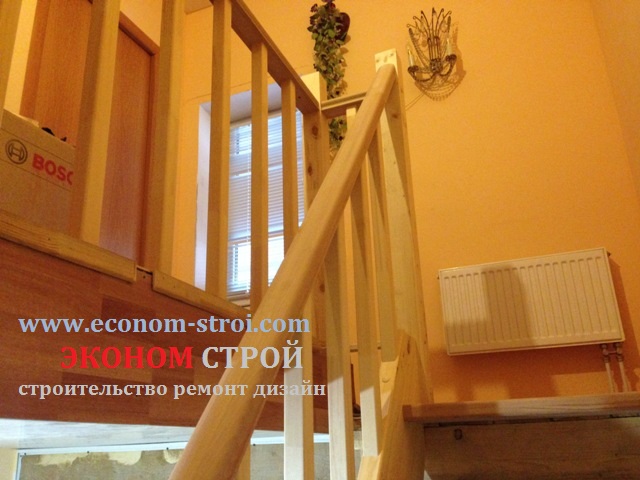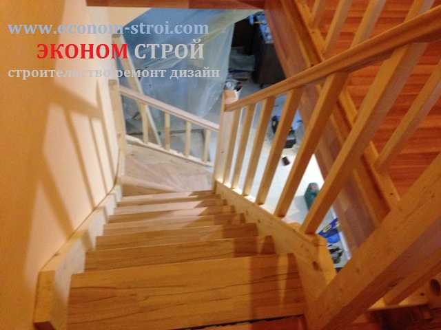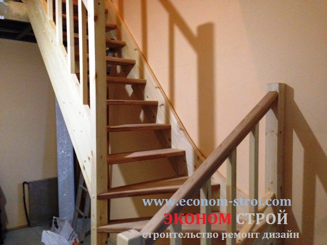 Недорогая забежная лестница из сосны с перильным ограждением.