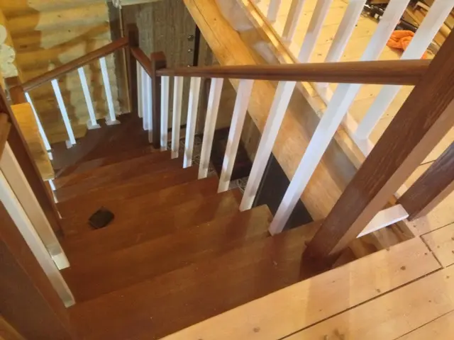 Покраска выполнена: ступени покрашены морилкой на 2 раза и затем лаком для полов яхтный Tikkurila Unica Super Strong, остальное краской для дерева "бетолюкс".
